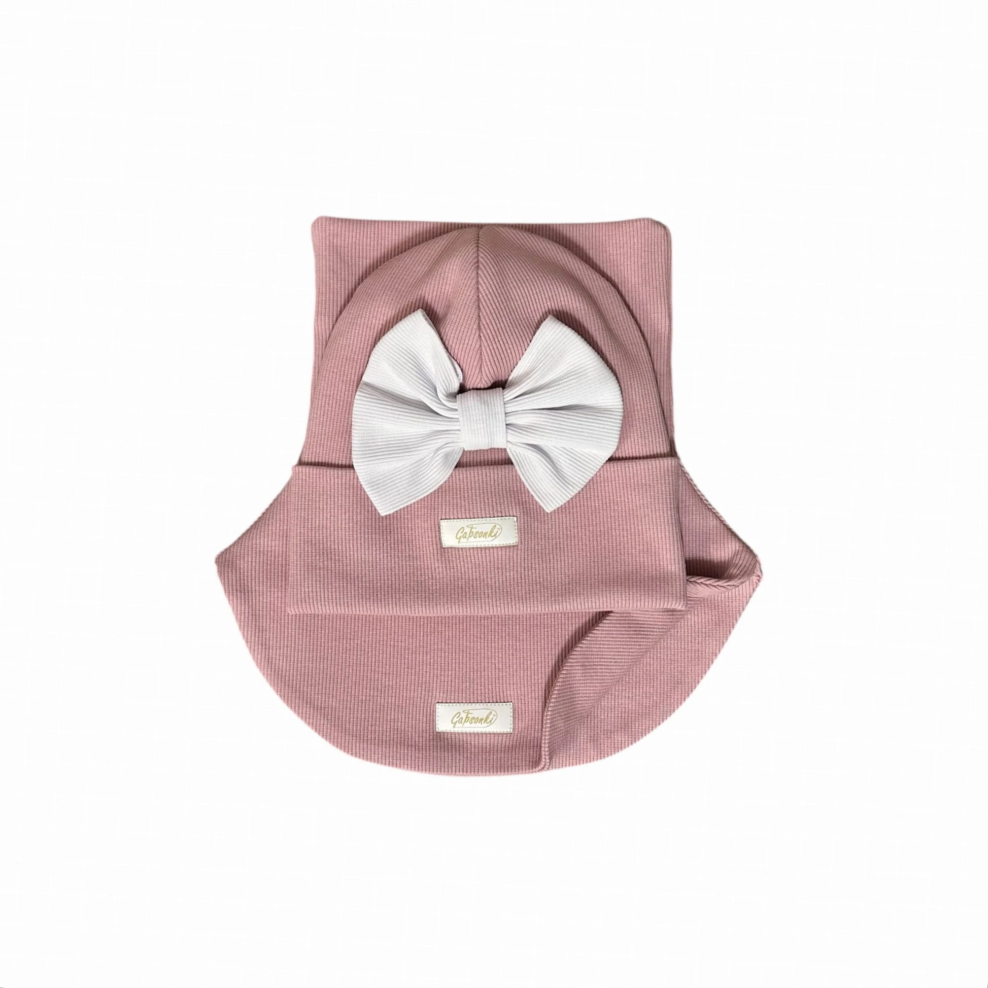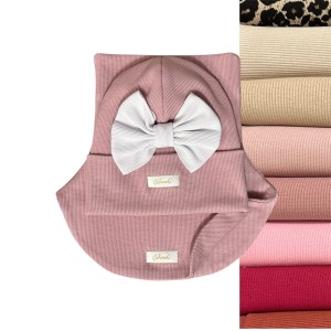 Zestaw dwuwarstwowy dla dziewczynki: Czapka z uroczą kokardą + Komino-golf z dzianiny prążkowanej.