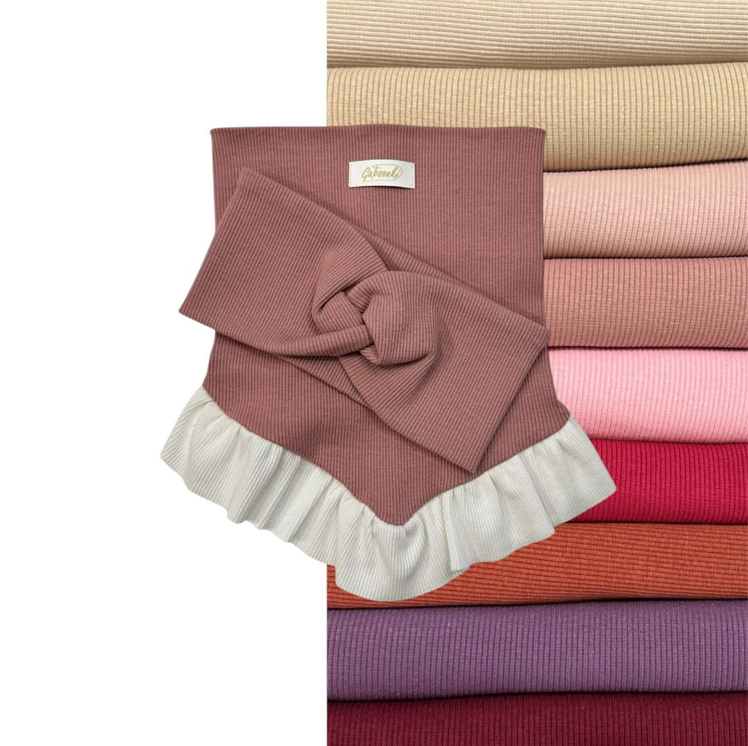 Nasz autorski projekt chusty. Urok chusty z falbanką połączony z funkcjonalnością komina, który dziecko może samo wygodnie założyć przez głowę.