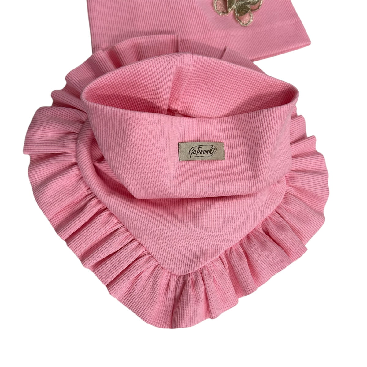 Komplet wiosenny czapka z motylkiem + komino-chusta z falbanką.